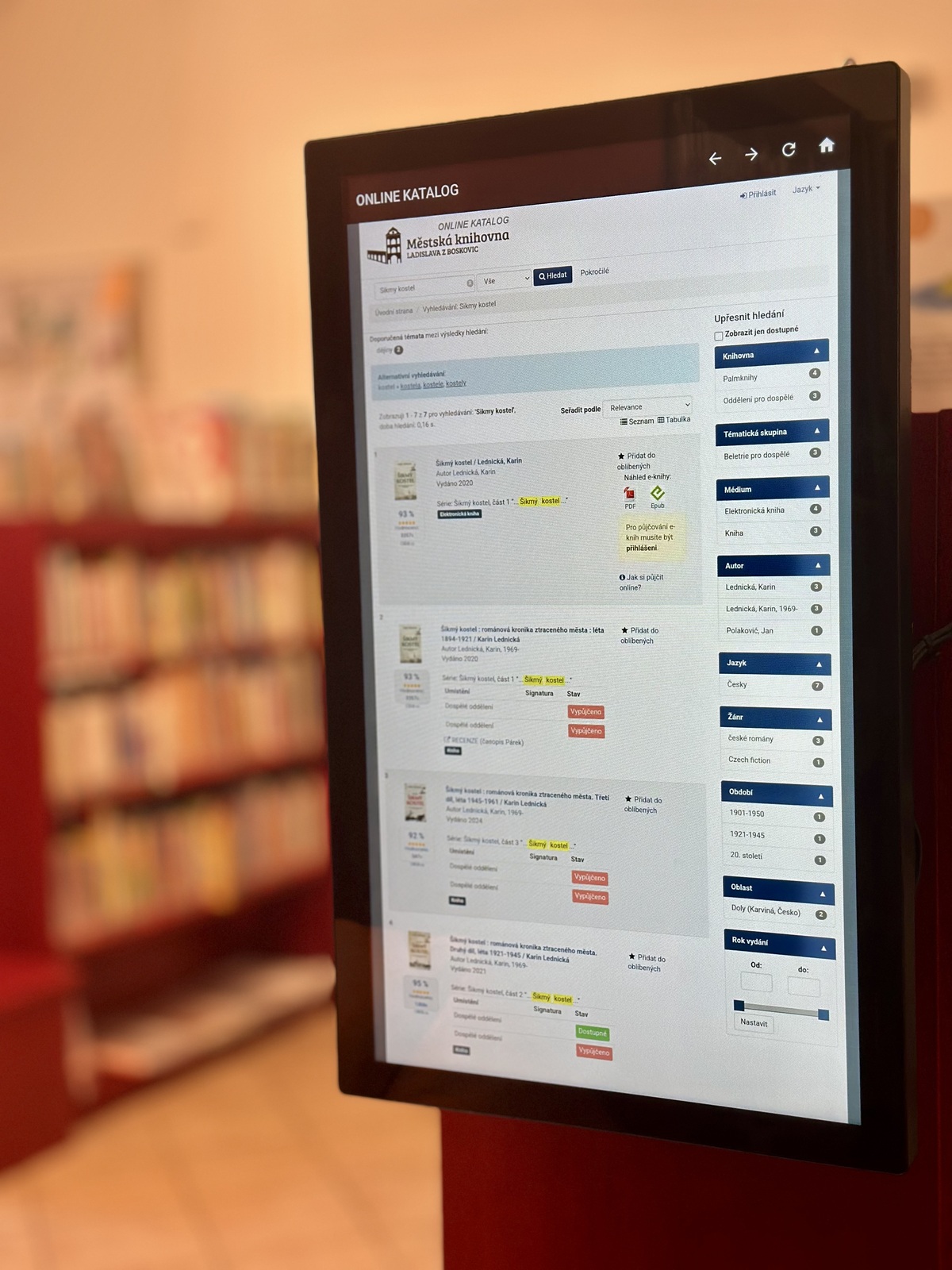 Možná jste si už všimli, že se nám v knihovně objevila nová zařízení. Jmenují se K-BOD, slouží k vyhledávání k online katalogu a pomohou Vám najít knížku, aniž byste museli jít až k pultu. Najdete v každé místnosti, kde není knihovník a šetří tak Vaše kroky. A když se přihlásíte do online katalogu, uvidíte, které tituly jste již měli půjčené. Navíc pak můžete v katalogu nejen vyhledávat, ale také si cokoli rezervovat. A svůj K-BOD mají i děti.