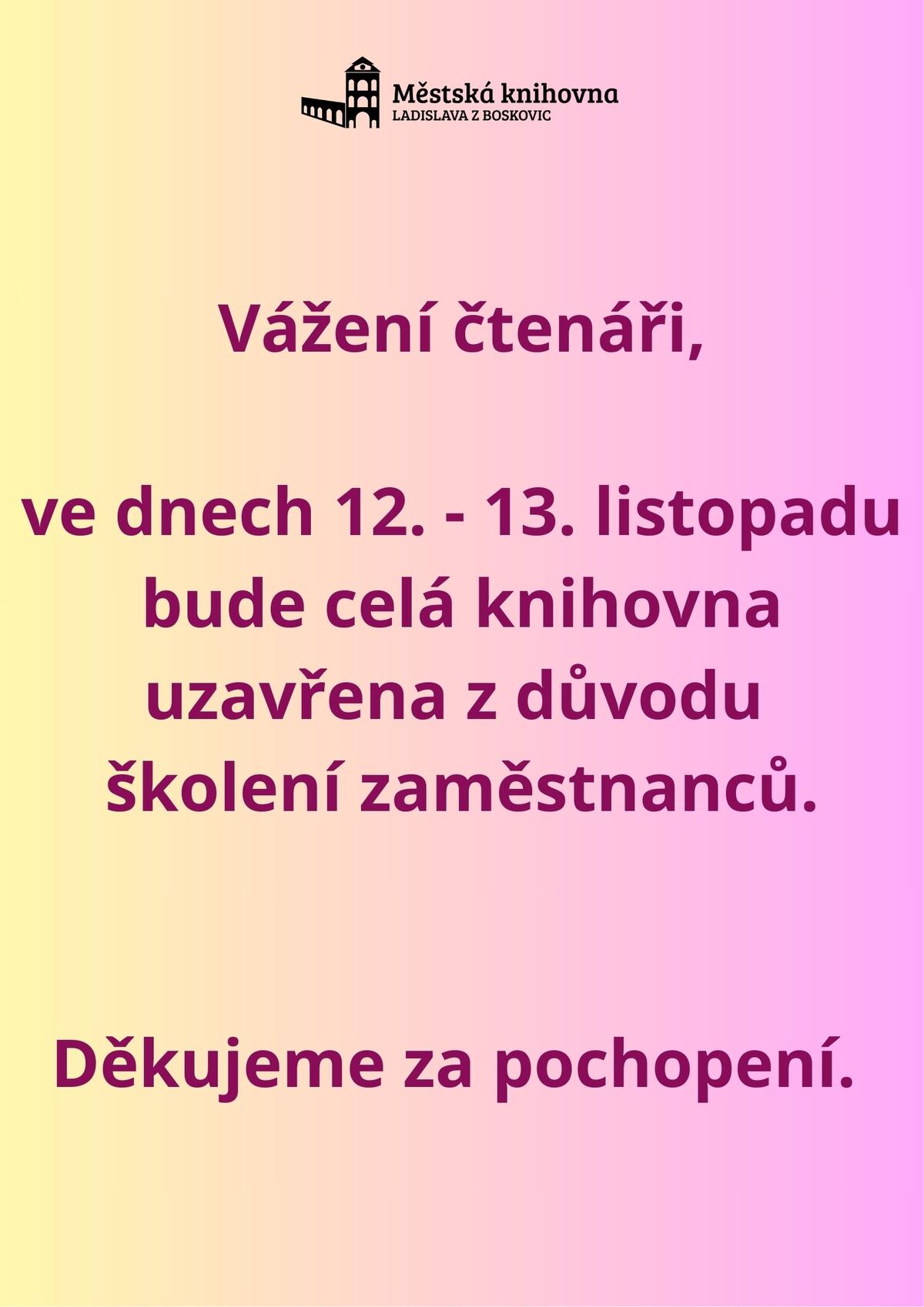 Uzavírka knihovny 12. - 13. 11. 2025 21.10.2025 / Akce Vážení návštěvníci, z důvodu školení zaměstnanců bude celá knihovna ve dnech 12. - 13. listopadu (středa + čtvrtek) uzavřena. Děkujeme za pochopení 😊