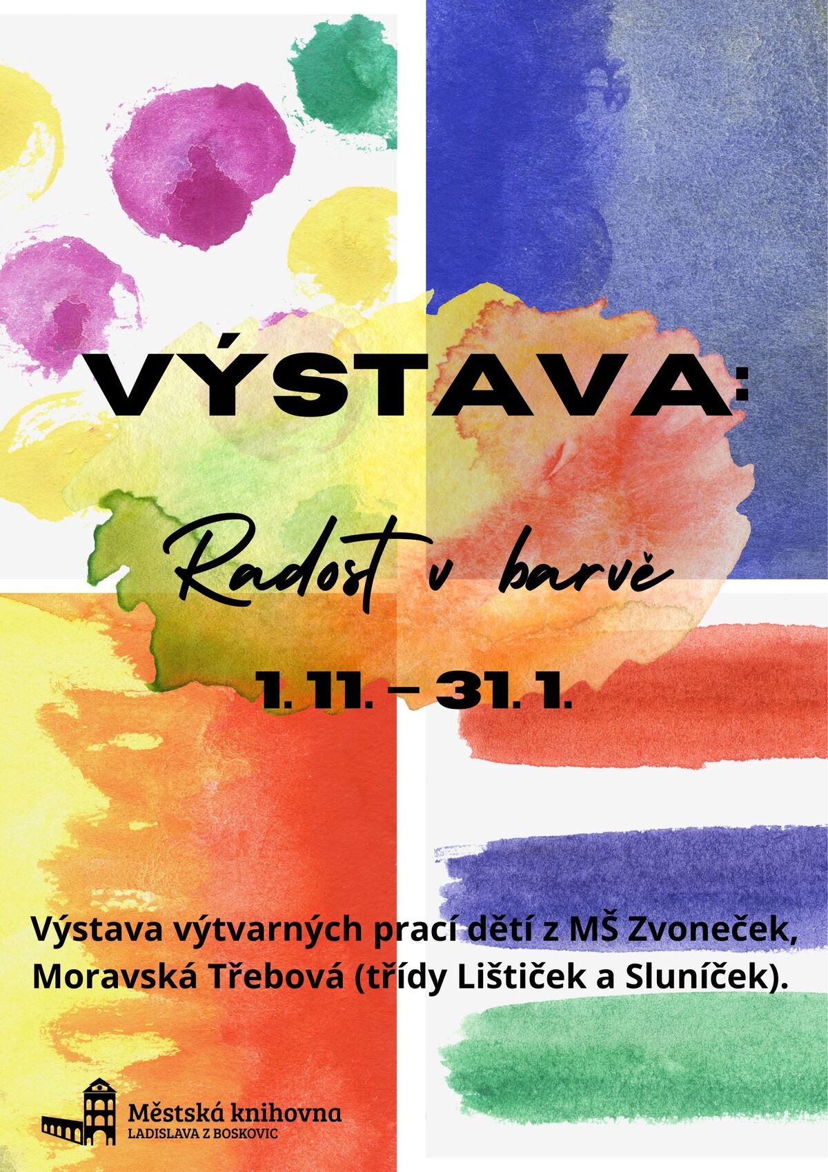 Výstava: Radost v barvě 31.10.2025 / Výstavy Výstava výtvarných prací dětí z MŠ Zvoneček, Moravská Třebová (třídy Lištiček a Sluníček).