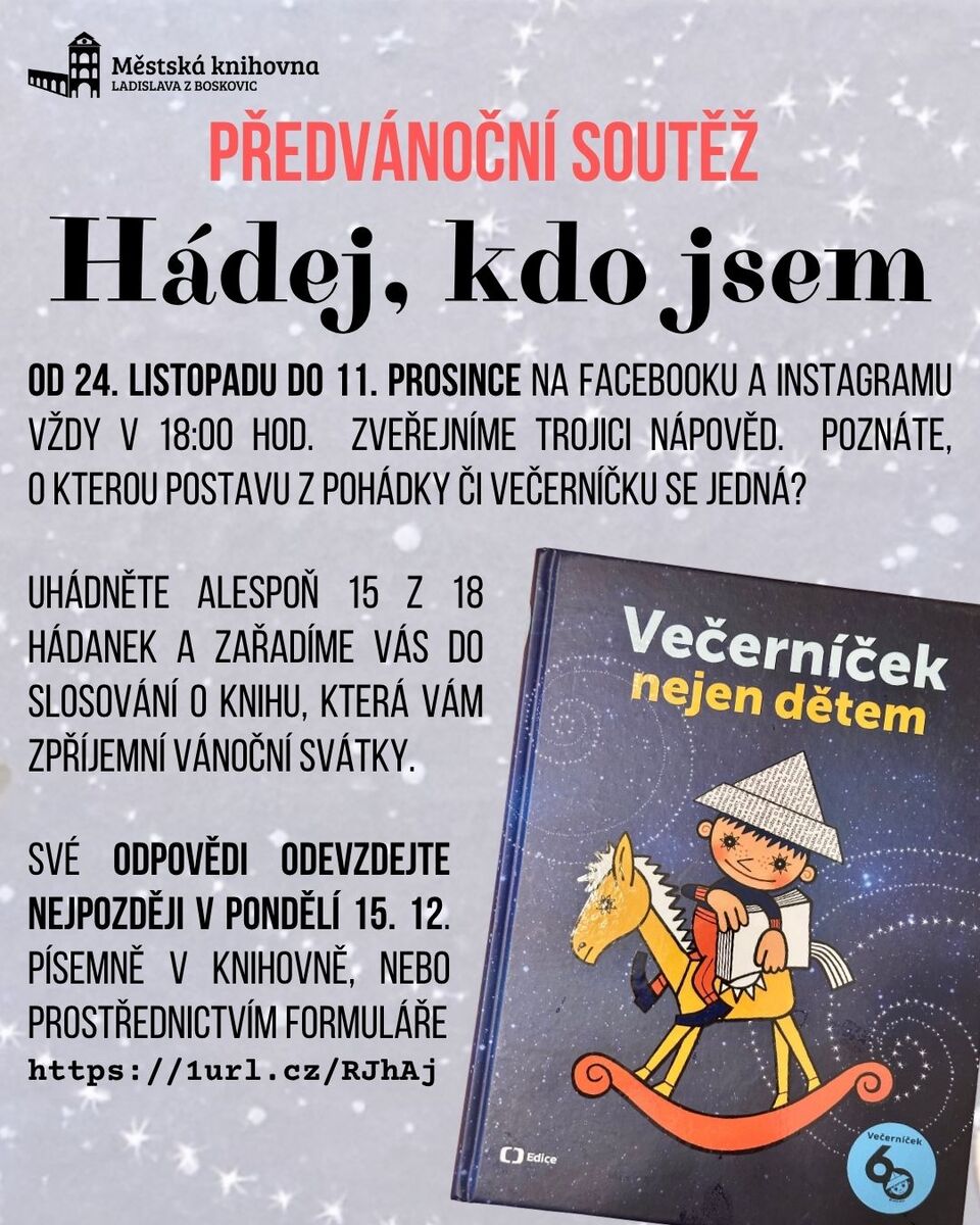 Chcete vyhrát knížku pod stromeček a ještě si u toho zkrátit čekání na Ježíška? Pak přesně pro vás připravujeme zábavné hledání pohádkových postav. Od 24. listopadu až do 11. prosince vždycky v 18:00 zveřejníme na našem Facebooku a Instagramu trojici nápověd. Uhádnete, o kterou postavu se jedná?