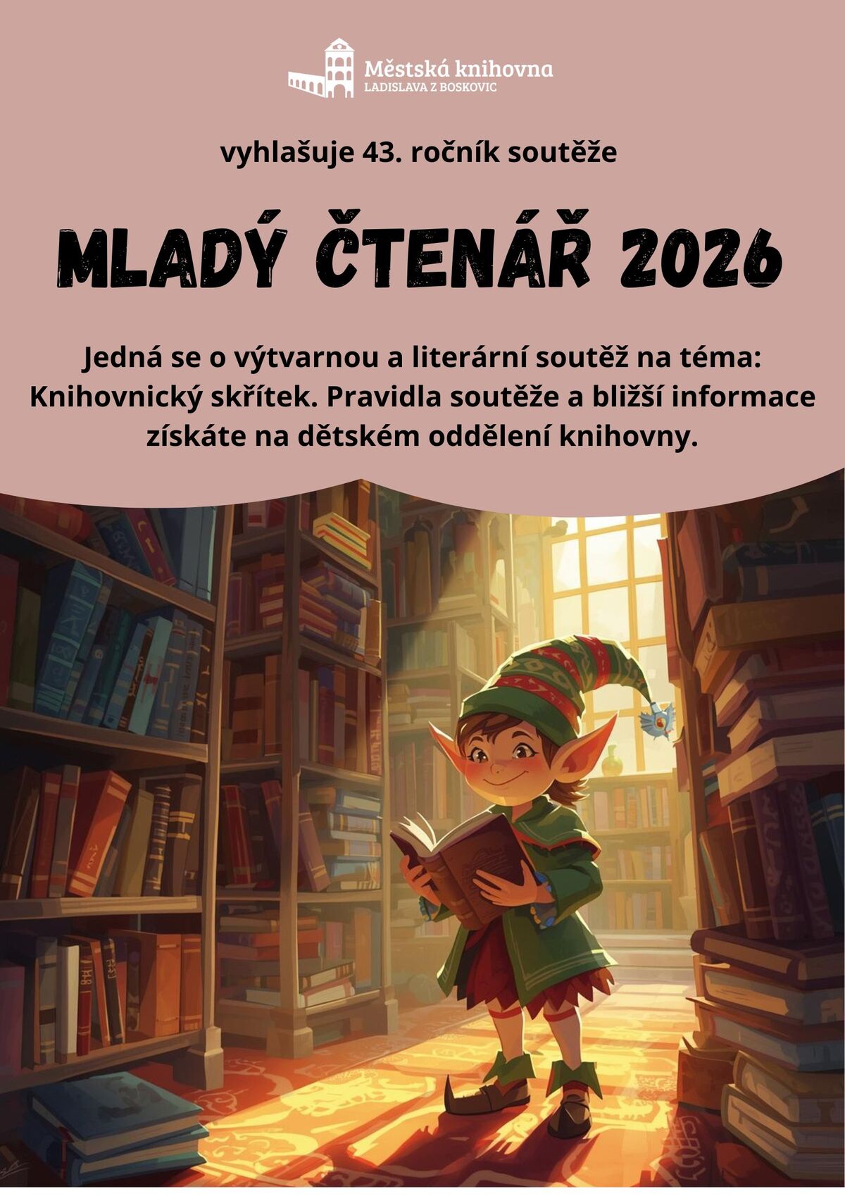 Městská knihovna vyhlašuje 43. ročník soutěže Mladý čtenář 2026. Jedná se o výtvarnou a literární soutěž na téma: Knihovnický skřítek. Pravidla soutěže a bližší informace získáte na dětském oddělení knihovny.