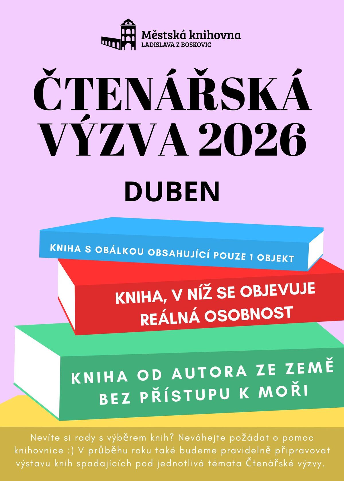 Server Databazeknih.cz každý rok vyhlašuje tzv. Čtenářskou výzvu. Od každého z témat je připraveno několik knih, které budeme postupně během celého roku vystavovat, abychom čtenářům usnadnili výběr mezi množstvím knih v knihovně. Více informací na dospělém oddělení knihovny.