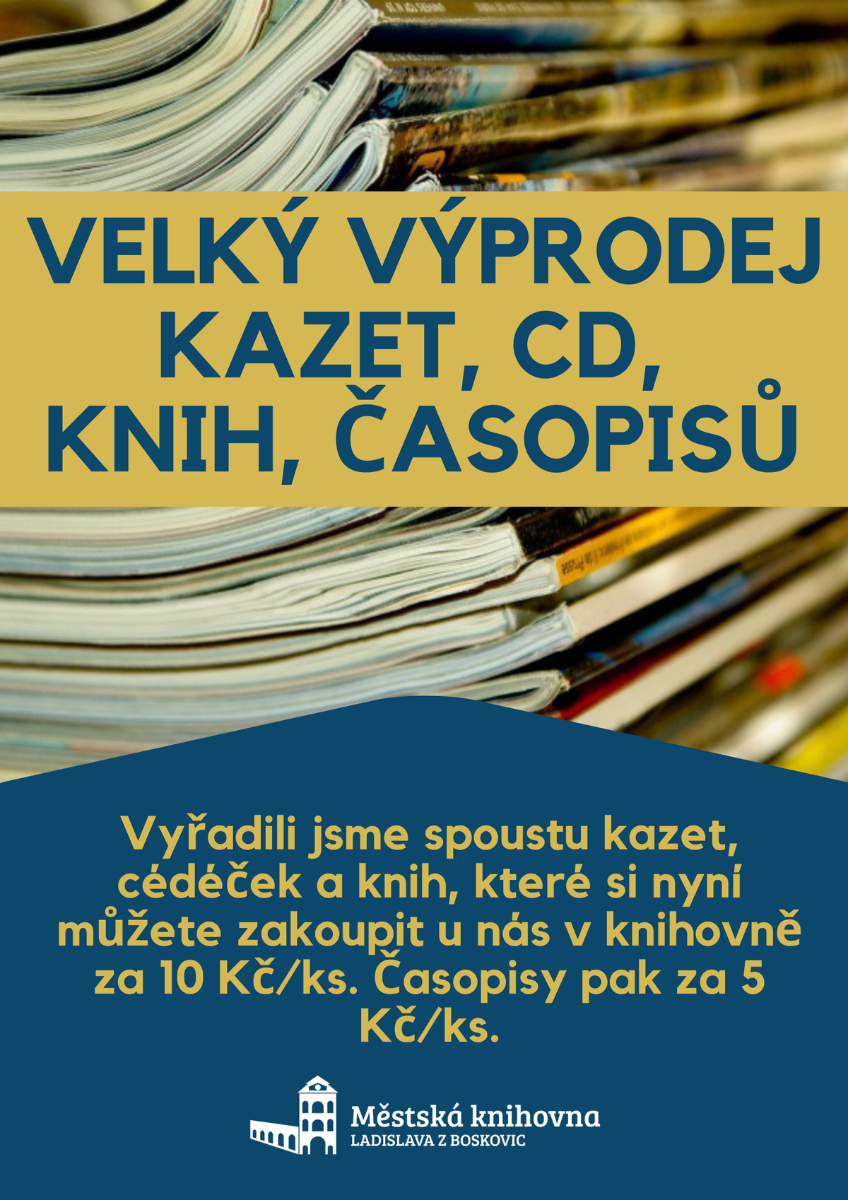 Výprodej CD, kazet, knih a časopisů 25.02.2022 / Informace Nabízíme vyřazené části fondu: v půjčovní době si můžete zakoupit časopis za 5 Kč/ks, případně knihu, CD či kazetu za 10 Kč/ks.