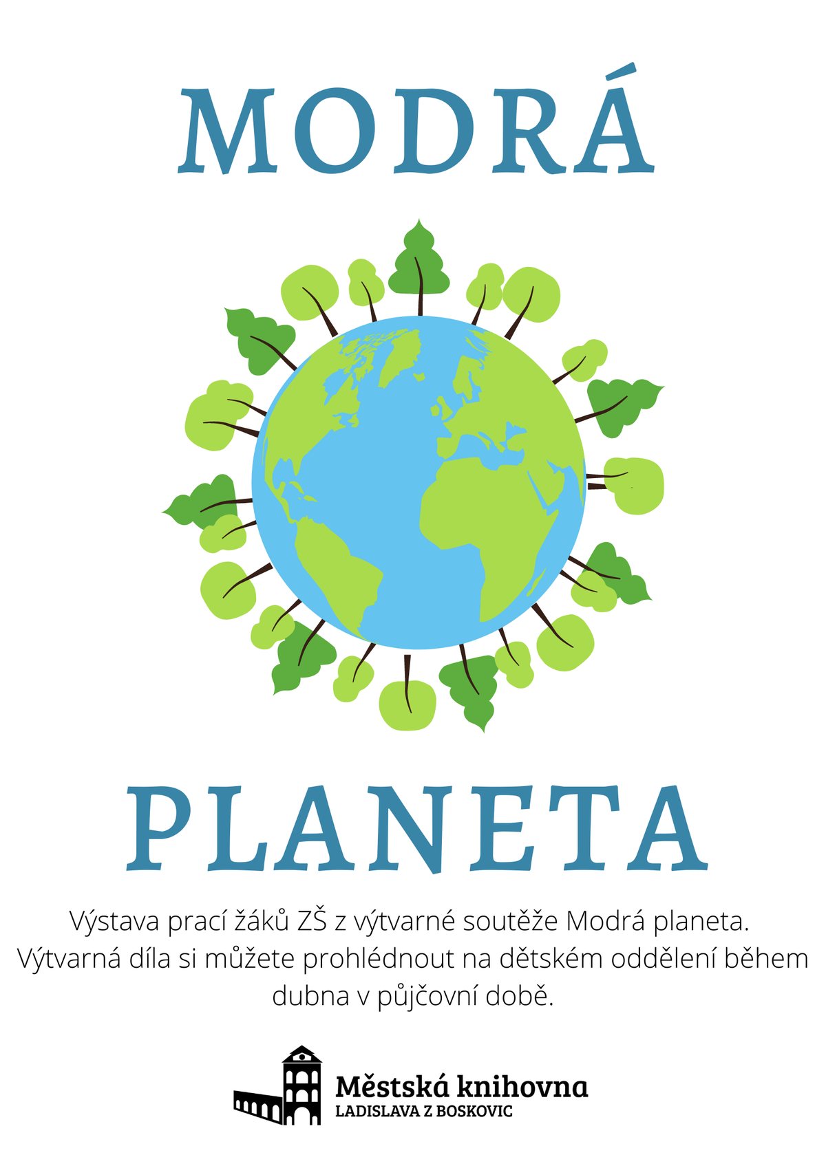Výstava: Modrá planeta 1.04.2022 / Informace Výstava prací ZŠ výtvarné soutěže Modrá planeta. Výtvarná díla si můžete prohlédnout na dětském oddělení v půjčovní době.