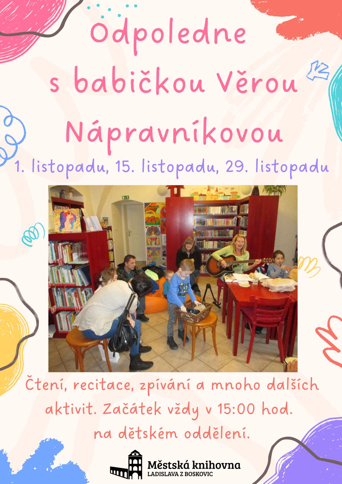 Odpoledne s babičkou 27.10.2022 / Akce Odpoledne s pohádkovou babičkou Věrou Nápravníkovou. Čtení, recitace, zpívání a mnoho dalších aktivit. Začátek vždy v 15:00 hod. v dětském oddělení.