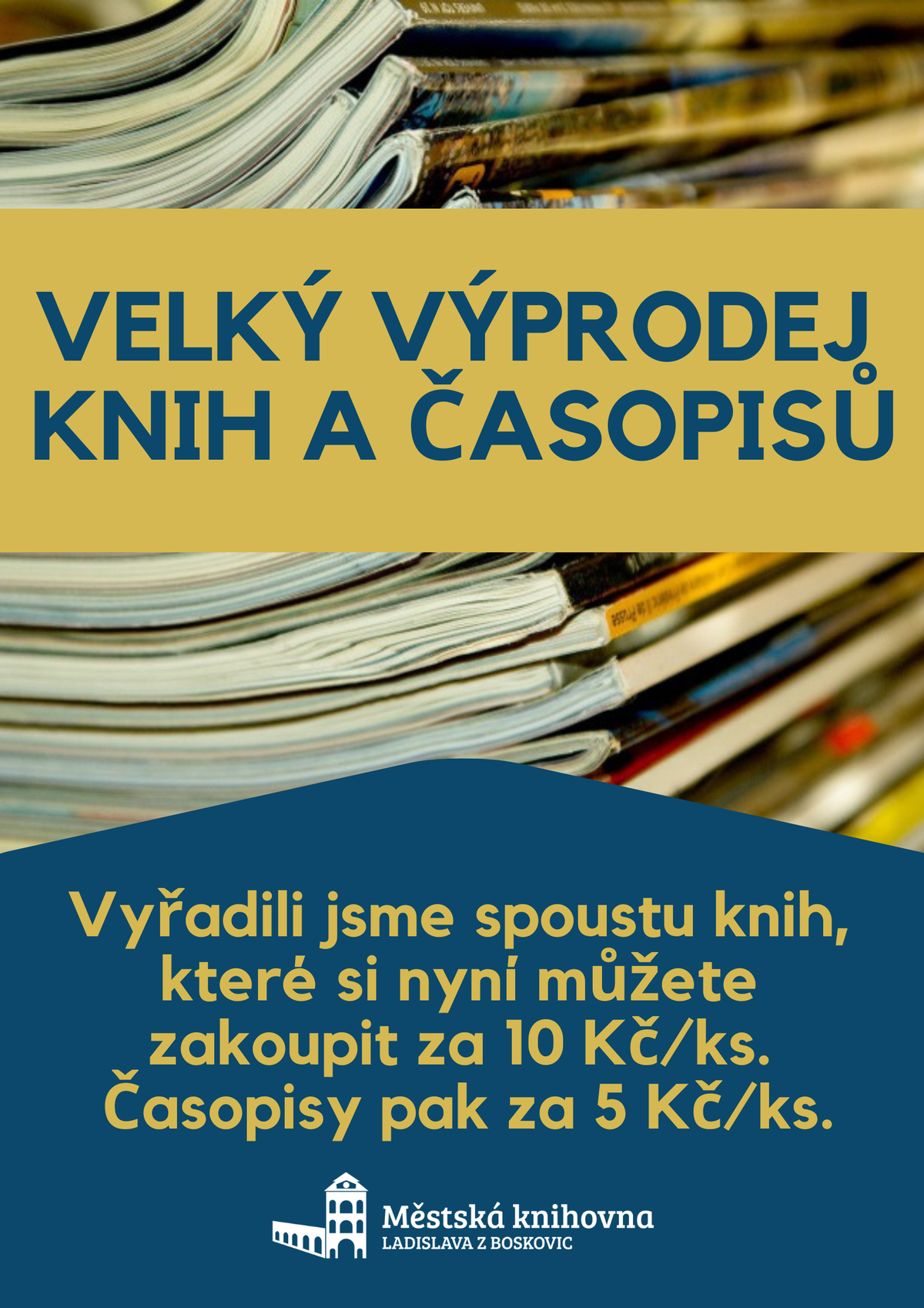 Velký výprodej knih a časopisů 1.12.2022 / Informace Ve vstupu do knihovny si můžete vybrat z vyřazených knih a časopisů. Knihy jsou za 10 Kč/ks a časopis za 5 Kč/ks.