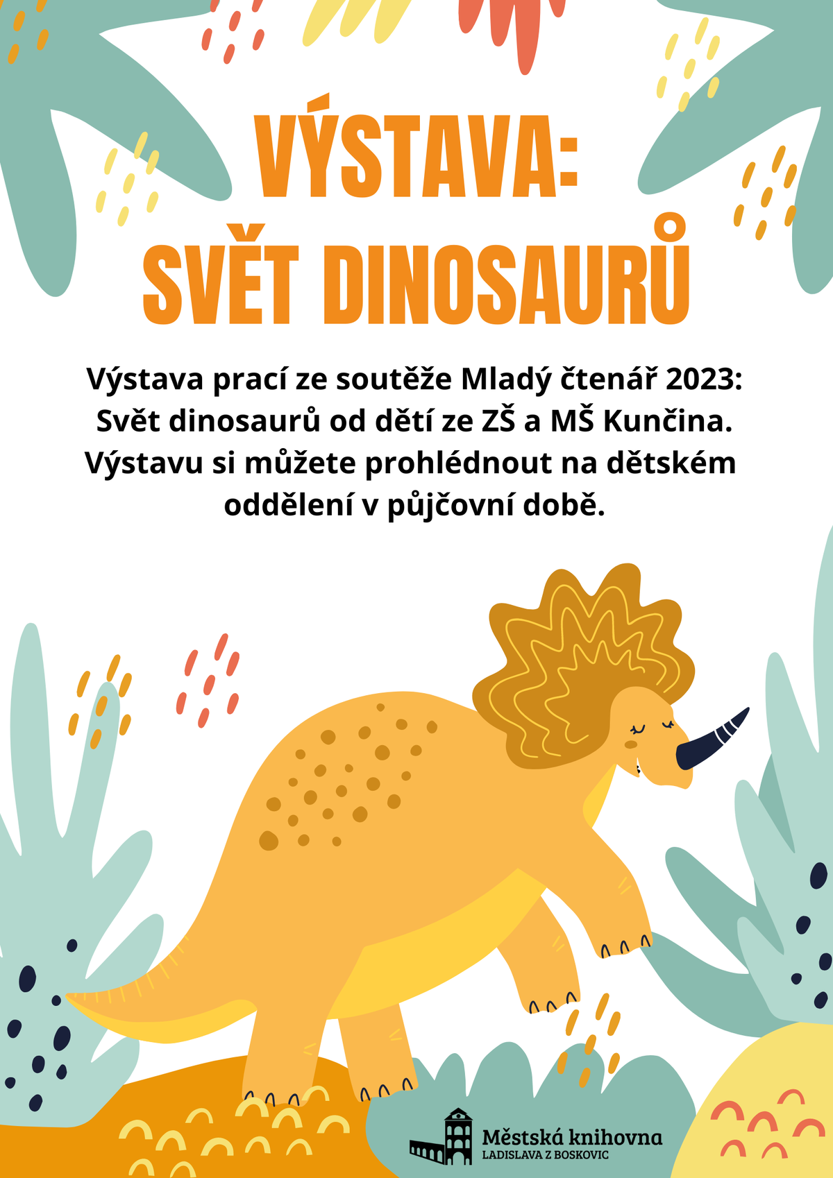 Výstava: Svět dinosaurů 2.06.2023 / Akce Výstava prací dětí a žáků MŠ a ZŠ Kunčina soutěže Mladý čtenář 2023 – Svět dinosaurů. Výstavu si můžete prohlédnout na dětském oddělení v půjčovní době.