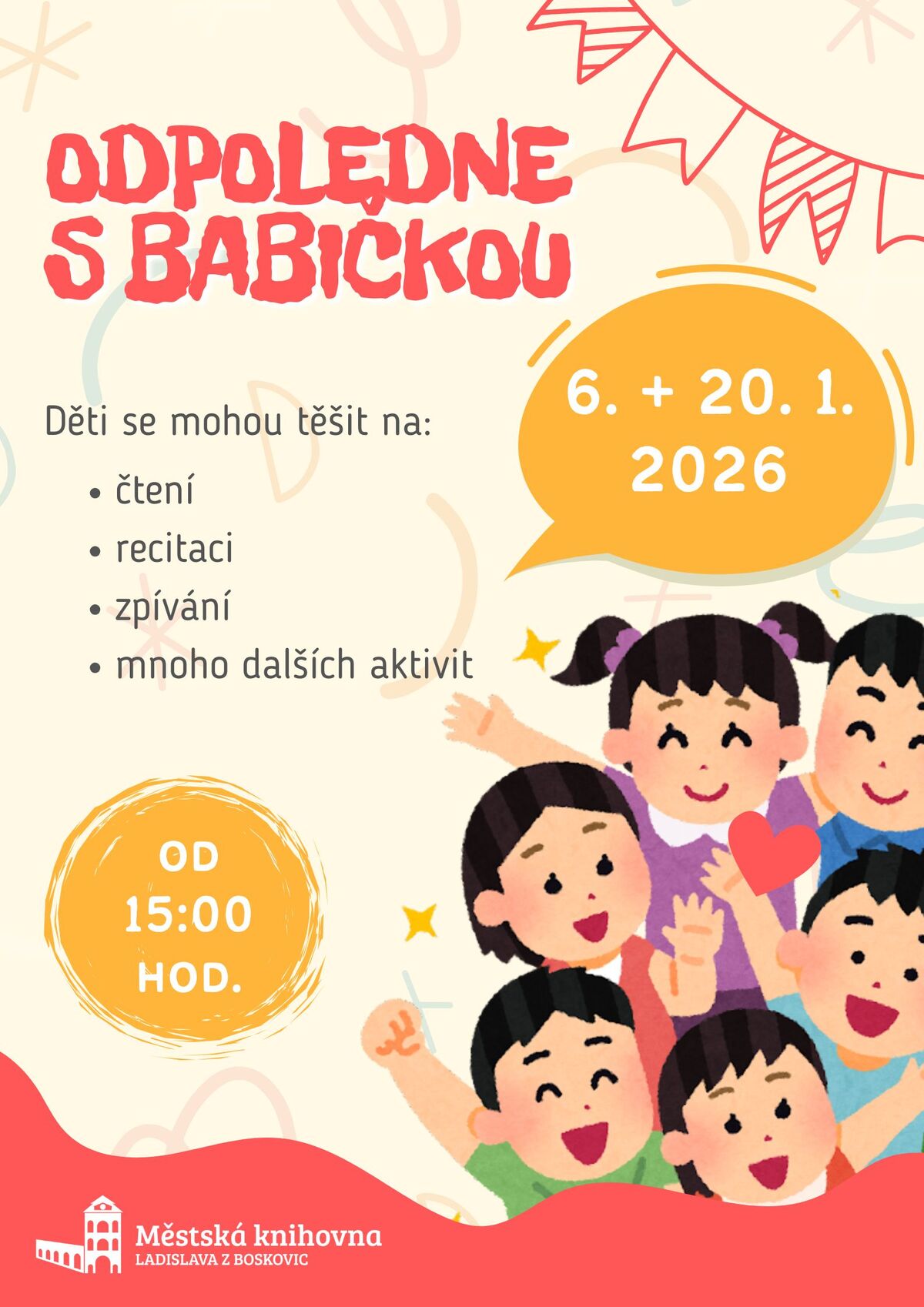 Odpoledne s babičkou 18.12.2025 / Akce 6. a 20. 1. Odpoledne s pohádkovou babičkou Věrou Nápravníkovou. Čtení, recitace, zpívání a mnoho dalších aktivit. Začátek vždy v 15:00 hod. v dětském oddělení.